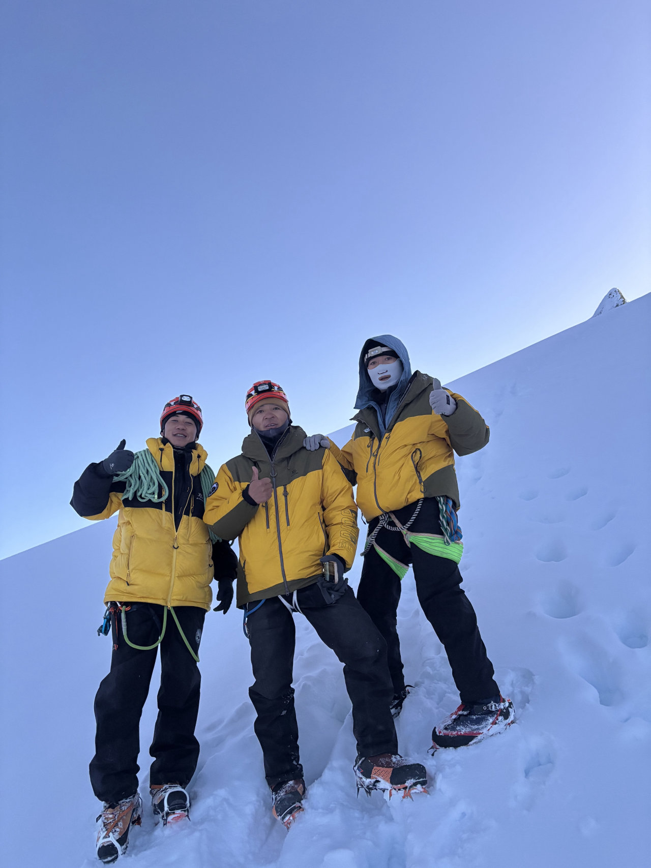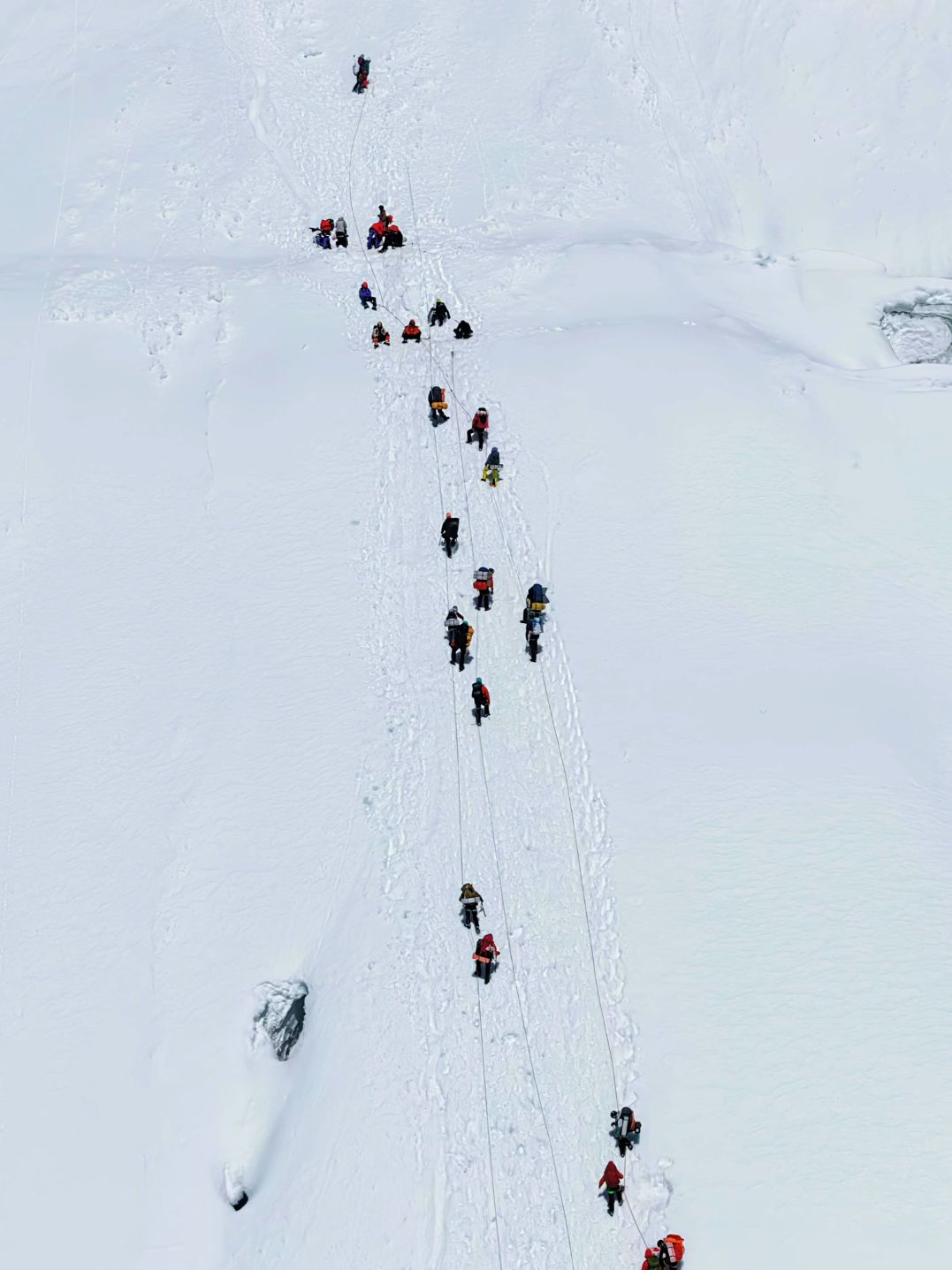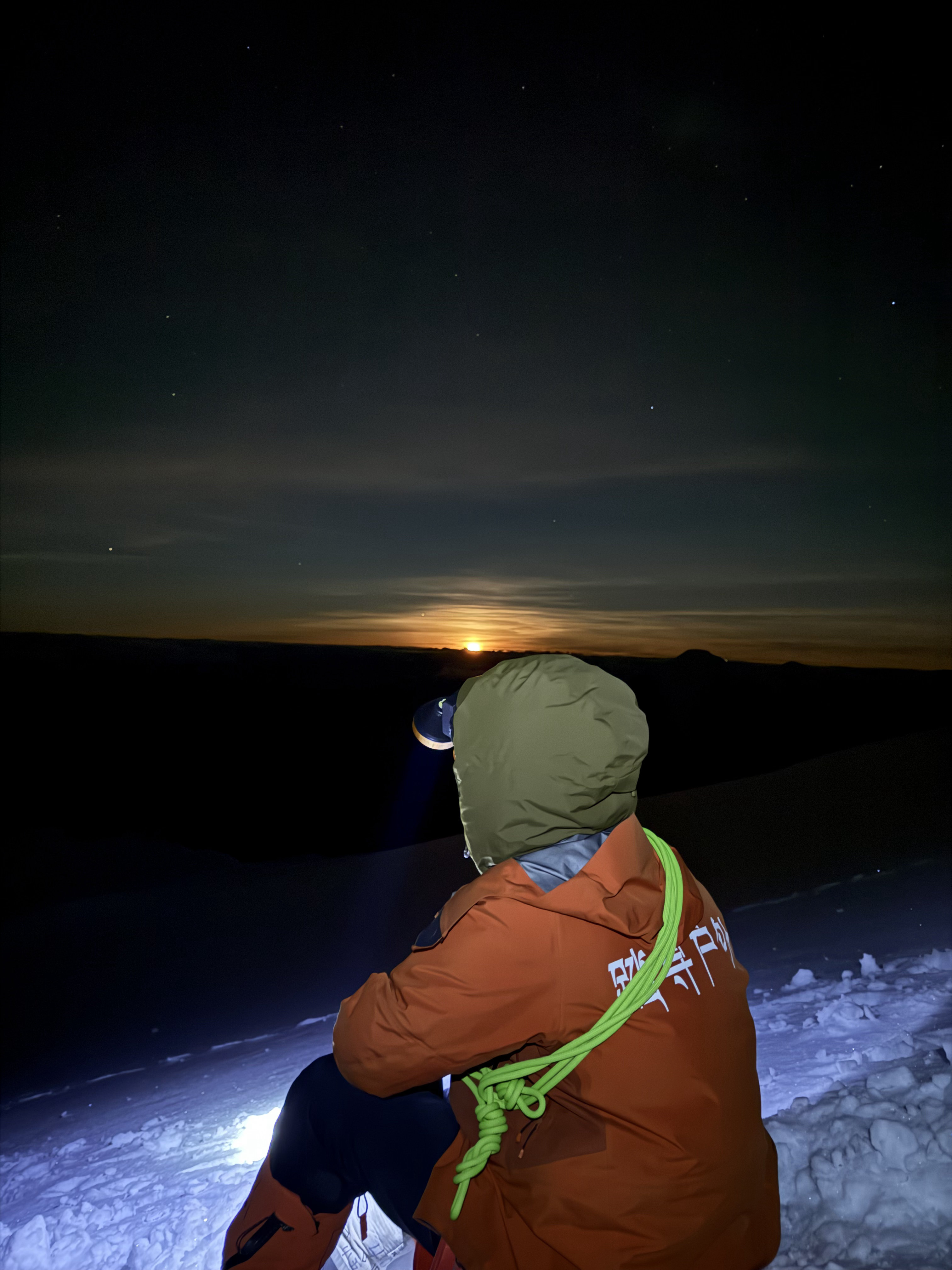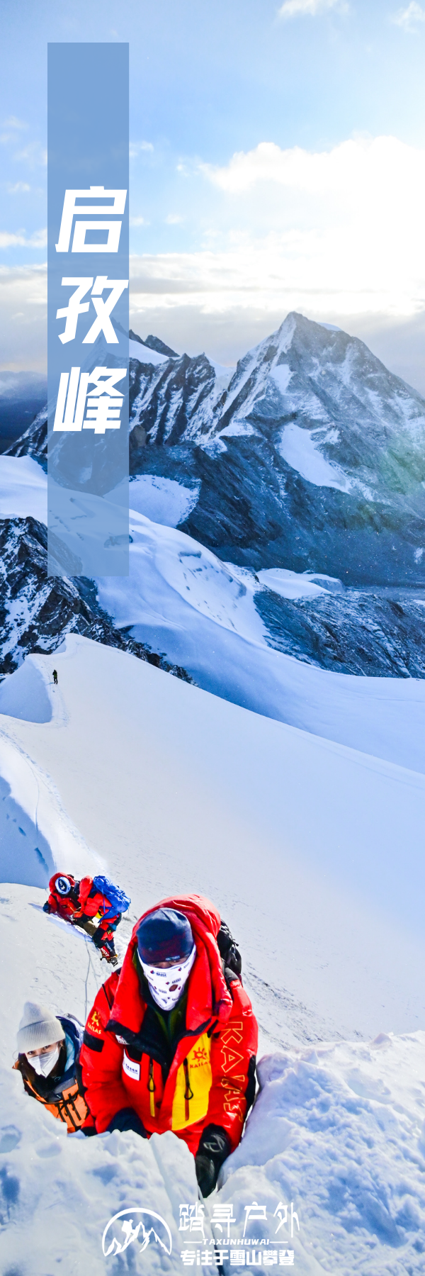 凌晨3点左右起床吃早餐后开始冲顶,全程主要为技术路段,路段以冰裂缝、冰壁和冰坡为主。最后需翻越两个冰壁,随后登顶6410米的峰顶。成功登顶之后下撤至C1营地。
