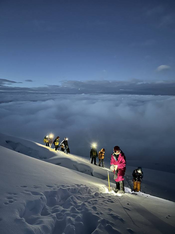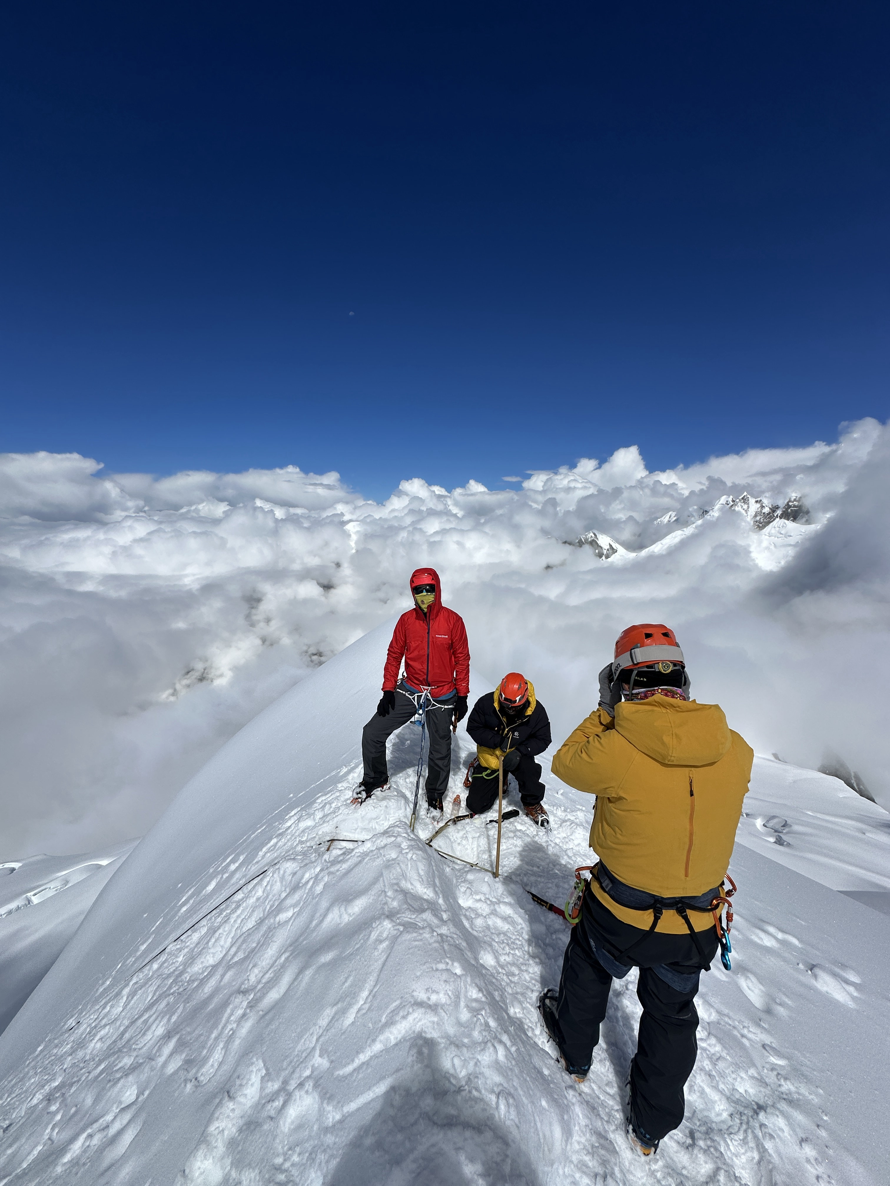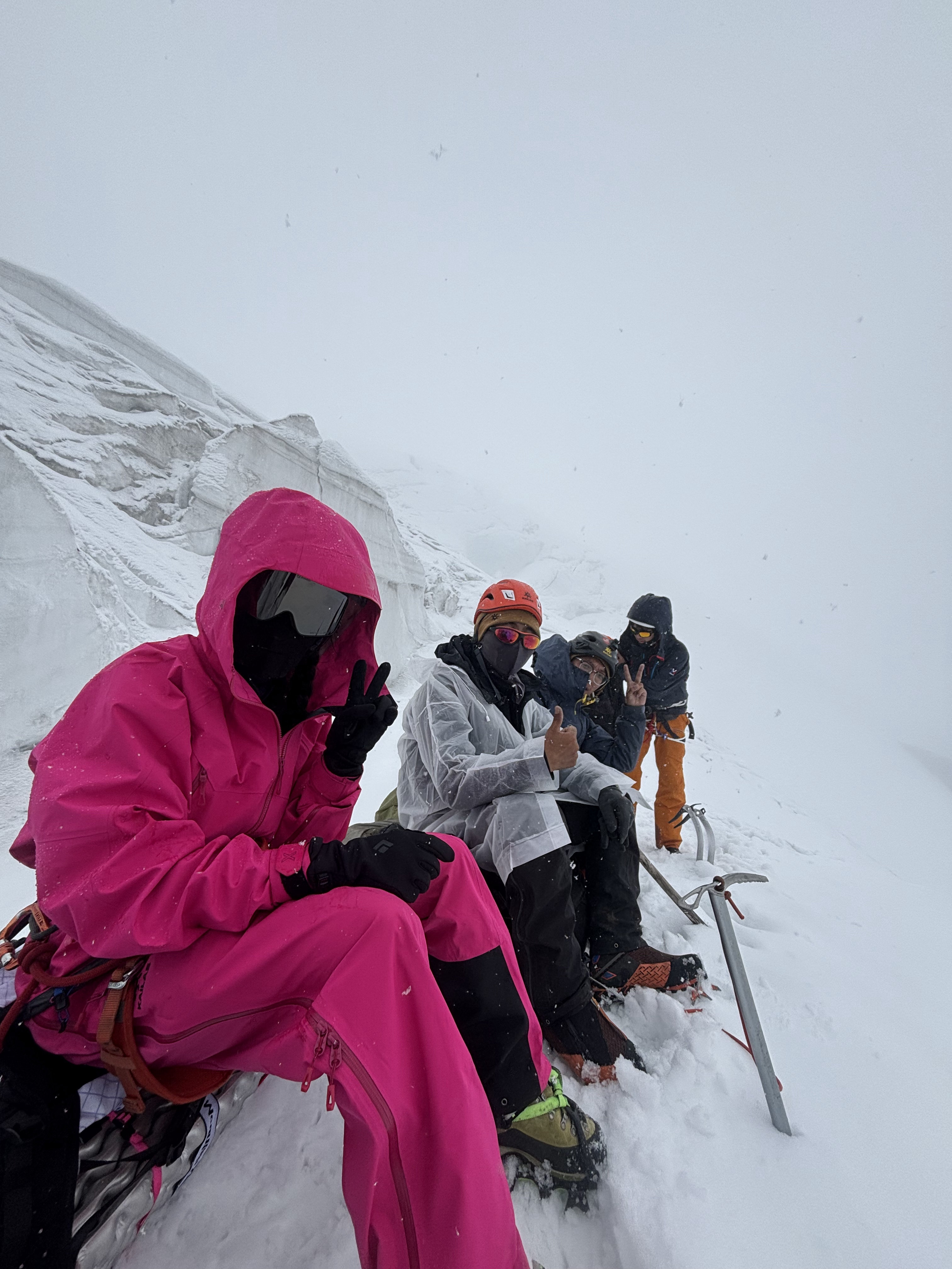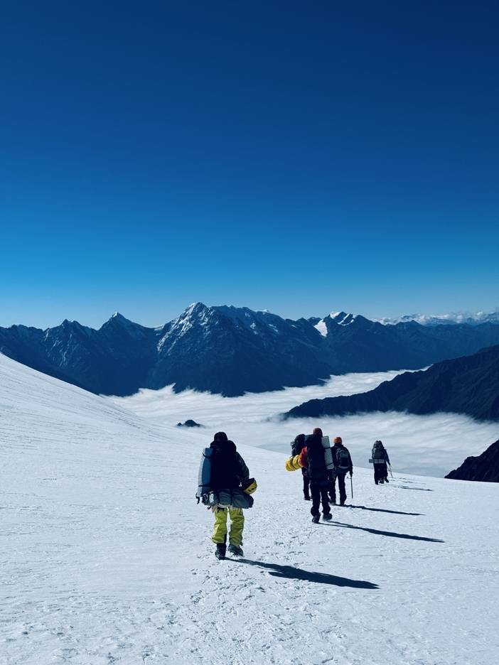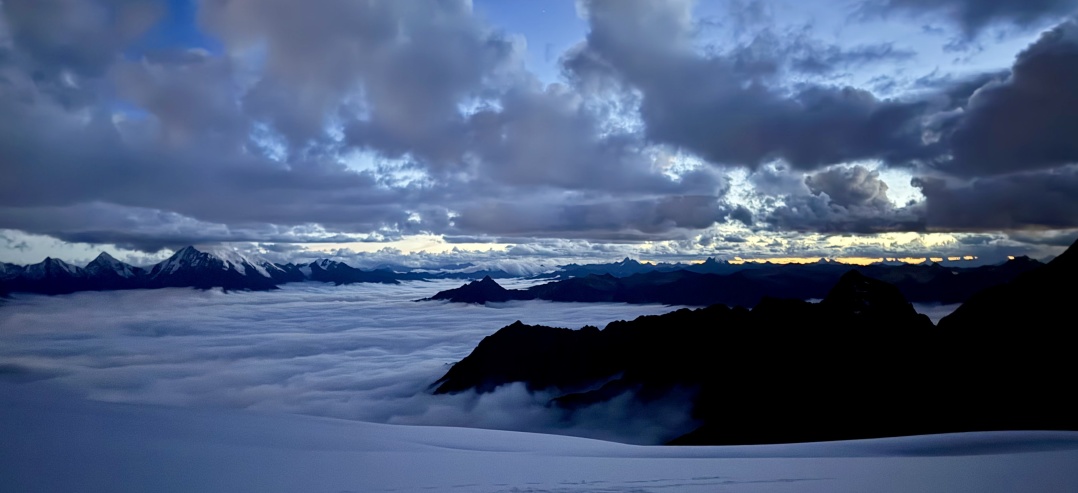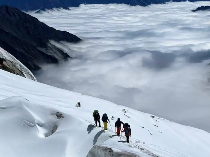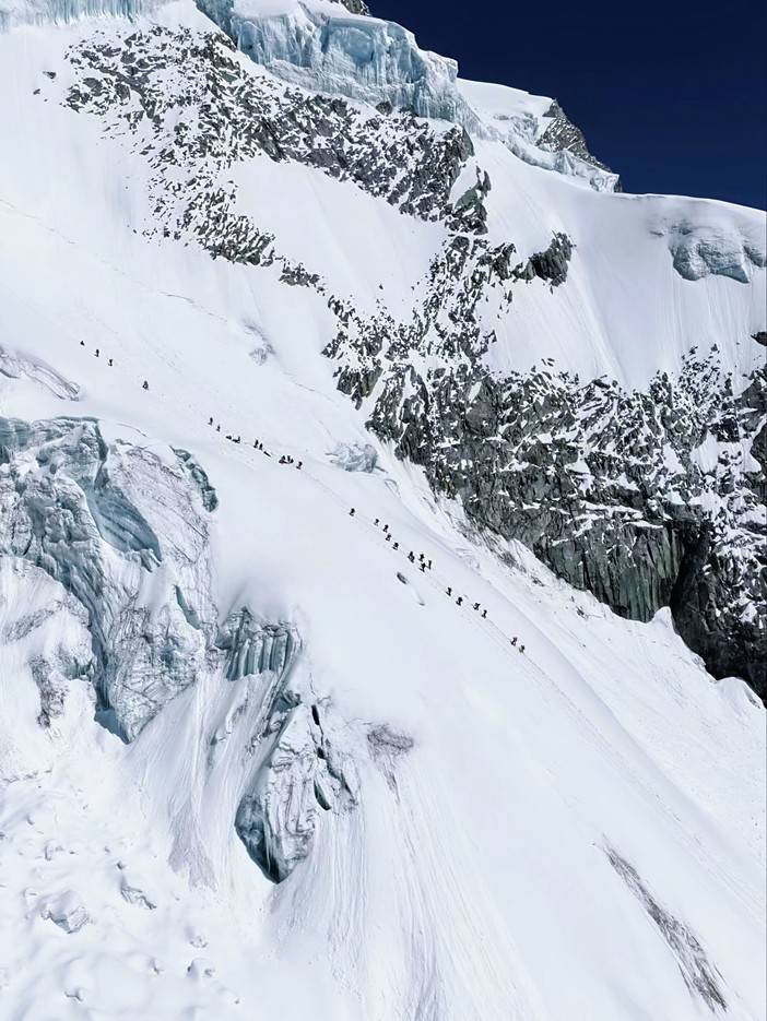 凌晨3点左右起床吃早餐后开始冲顶,全程主要为技术路段,路段以冰裂缝、冰壁和冰坡为主。最后需翻越两个冰壁,随后登顶6410米的峰顶。成功登顶之后下撤至C1营地。