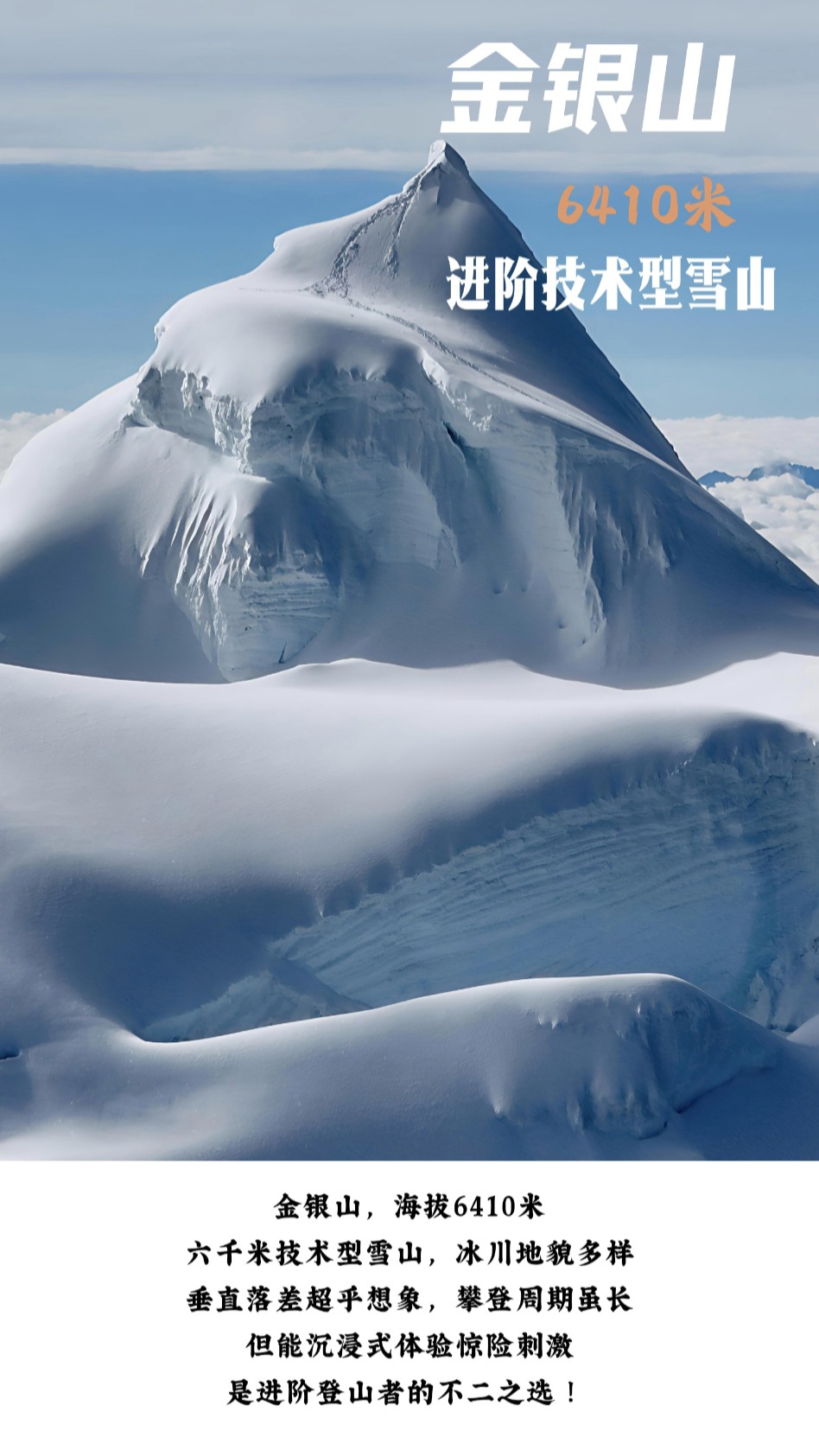 此山北连多峰,与大雪山山脉一体,和贡嘎主峰南北对望,站在山顶可眺望多处山脉。同时,金银山气候多变。南坡垂直立体气候,天气变化剧烈,东坡陡峭险峻,攀登难度极高,仅两次攀登记录,仍是高难度山峰。