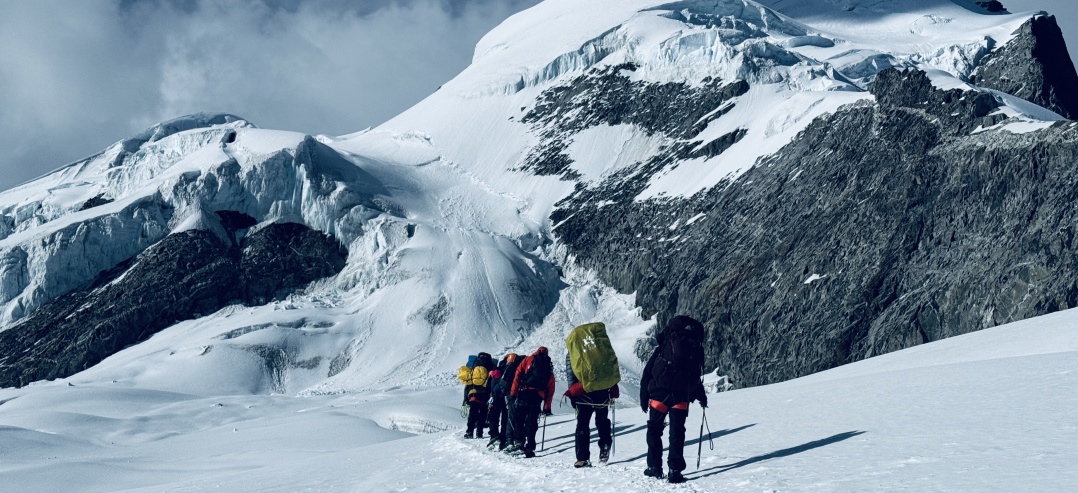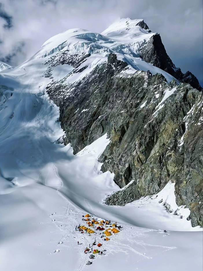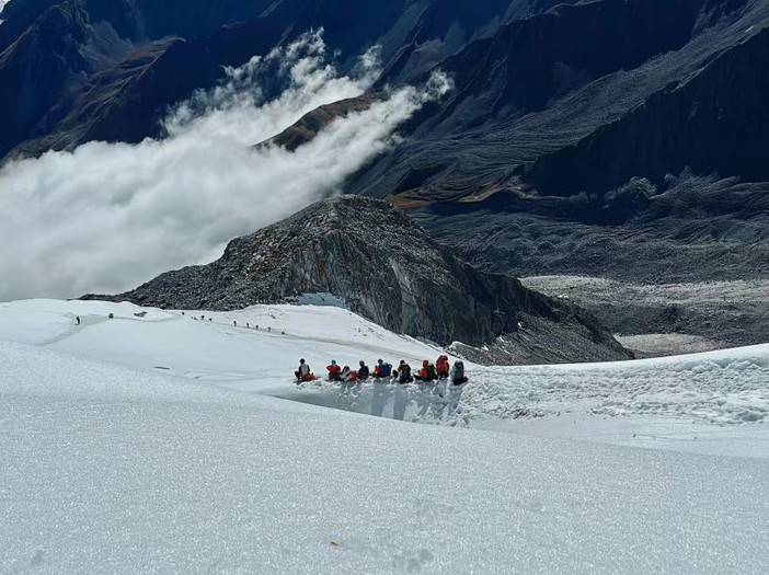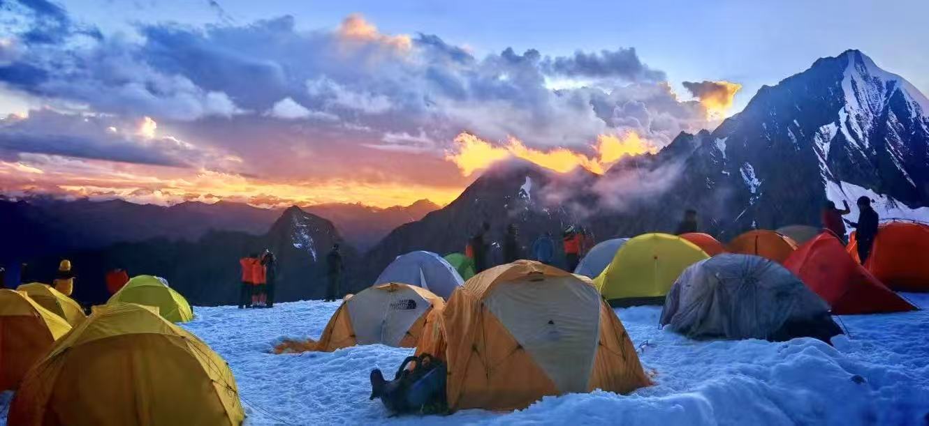 早餐后穿戴好装备,今日路段主要是碎石坡、冰雪坡,全程约7小时到达C2营地。在600米的上升距离中,能让大家熟悉冰川行进,路上有冰裂缝,需结组前进。