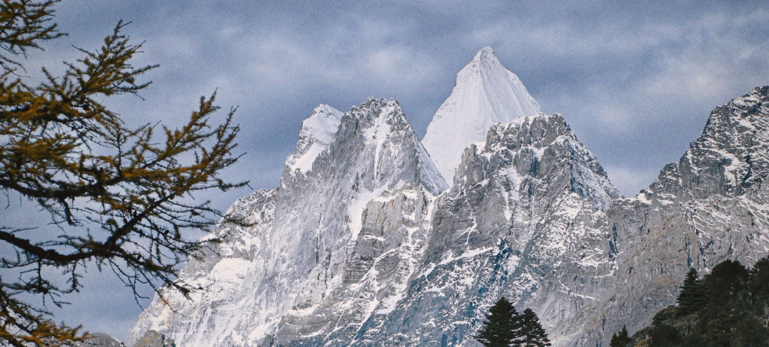 金银山位于大雪山脉贡嘎雪山峰南侧,海拔6410米,又名朱山,是贡嘎峰南山脊最靠南的六千米级卫峰之一,也是海螺沟景区标志性山峰,形似折扇,因常现日照金山得名。