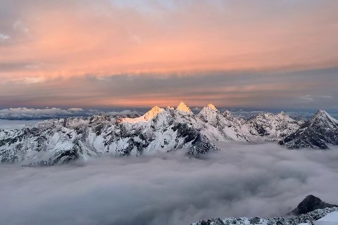 凌晨3点左右起床吃营地早餐,检查装备,然后向峰顶冲击。向导一对一进行协作冲顶,冲顶里程约6.8公里。攀登约4-5小时到达顶峰,可欣赏醉人的日出及日照金山,拍照庆祝后有序进行下撤。