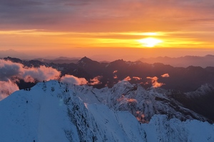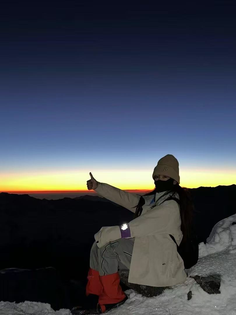 凌晨3点左右起床吃营地早餐,检查装备,然后向峰顶冲击。向导一对一进行协作冲顶,冲顶里程约4公里。攀登约3-4小时到达顶峰,可欣赏醉人的日出及日照金山,拍照庆祝后有序进行下撤。