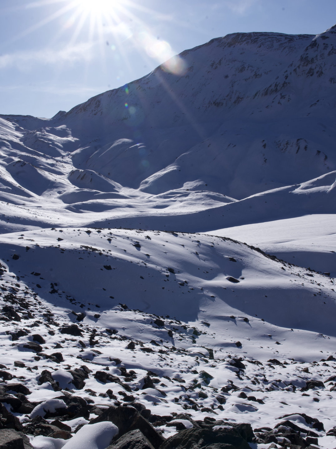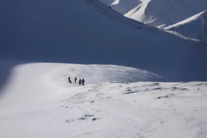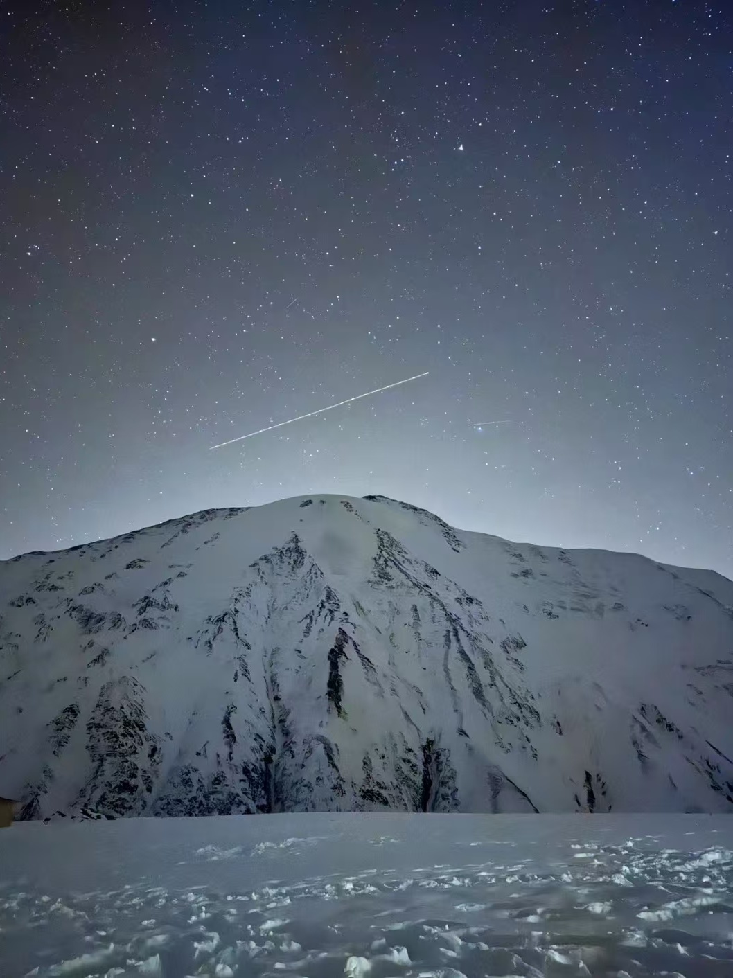凌晨2点起床,简单吃过早餐后,凌晨3点开始岗什卡主峰的冲顶攀登。从BC营地出发大约3.5公里左右抵达岗什卡主峰起攀点。