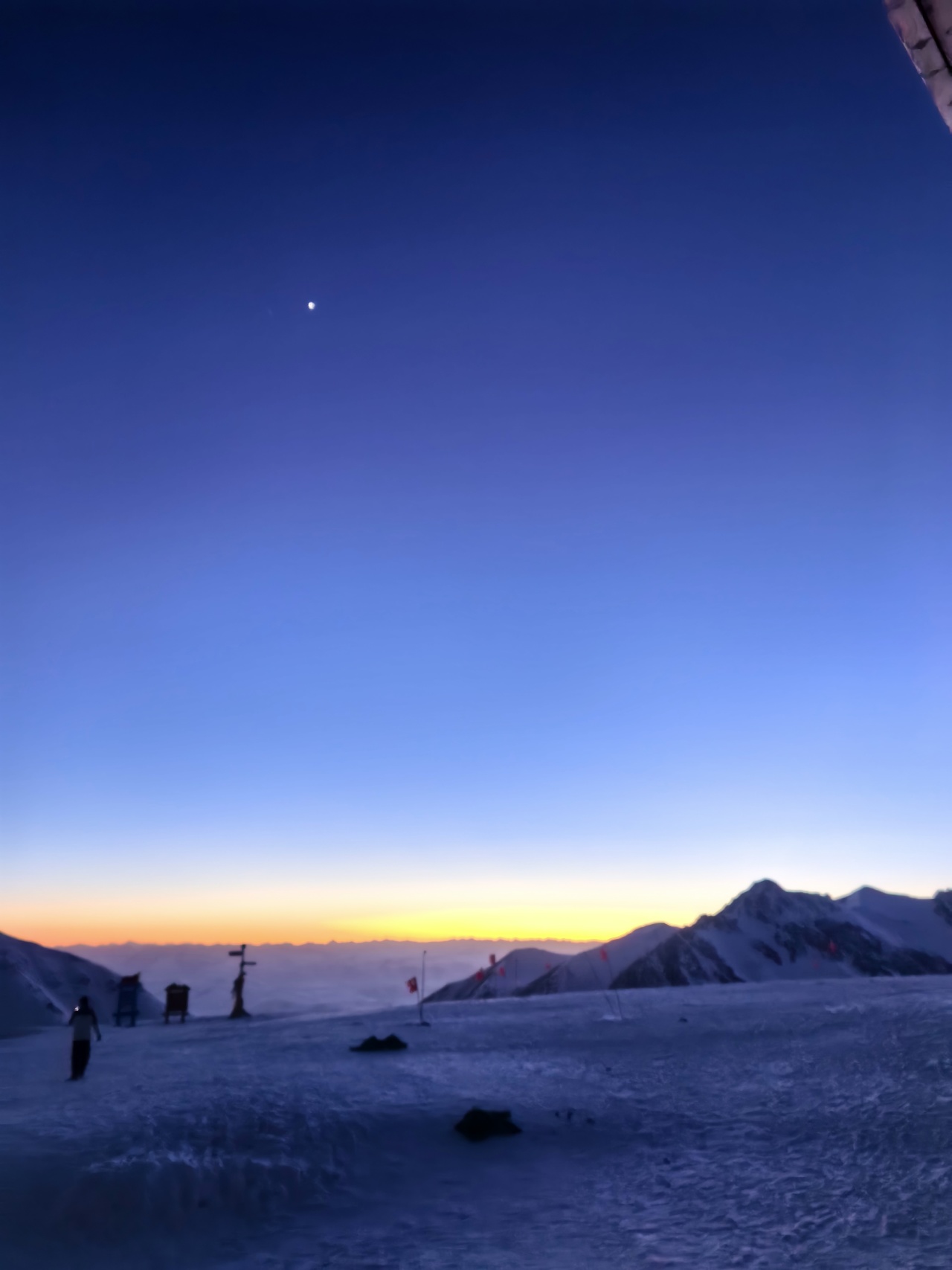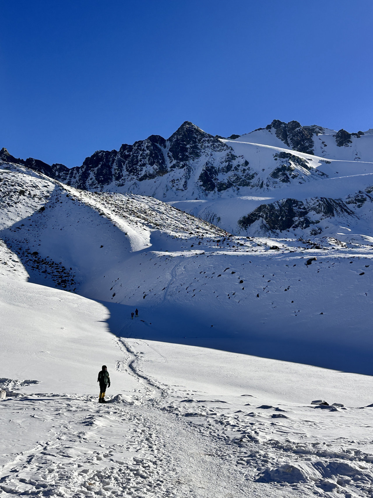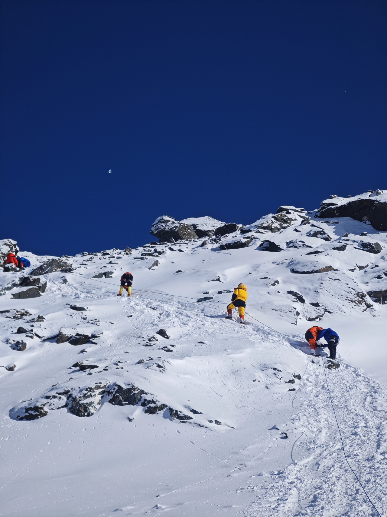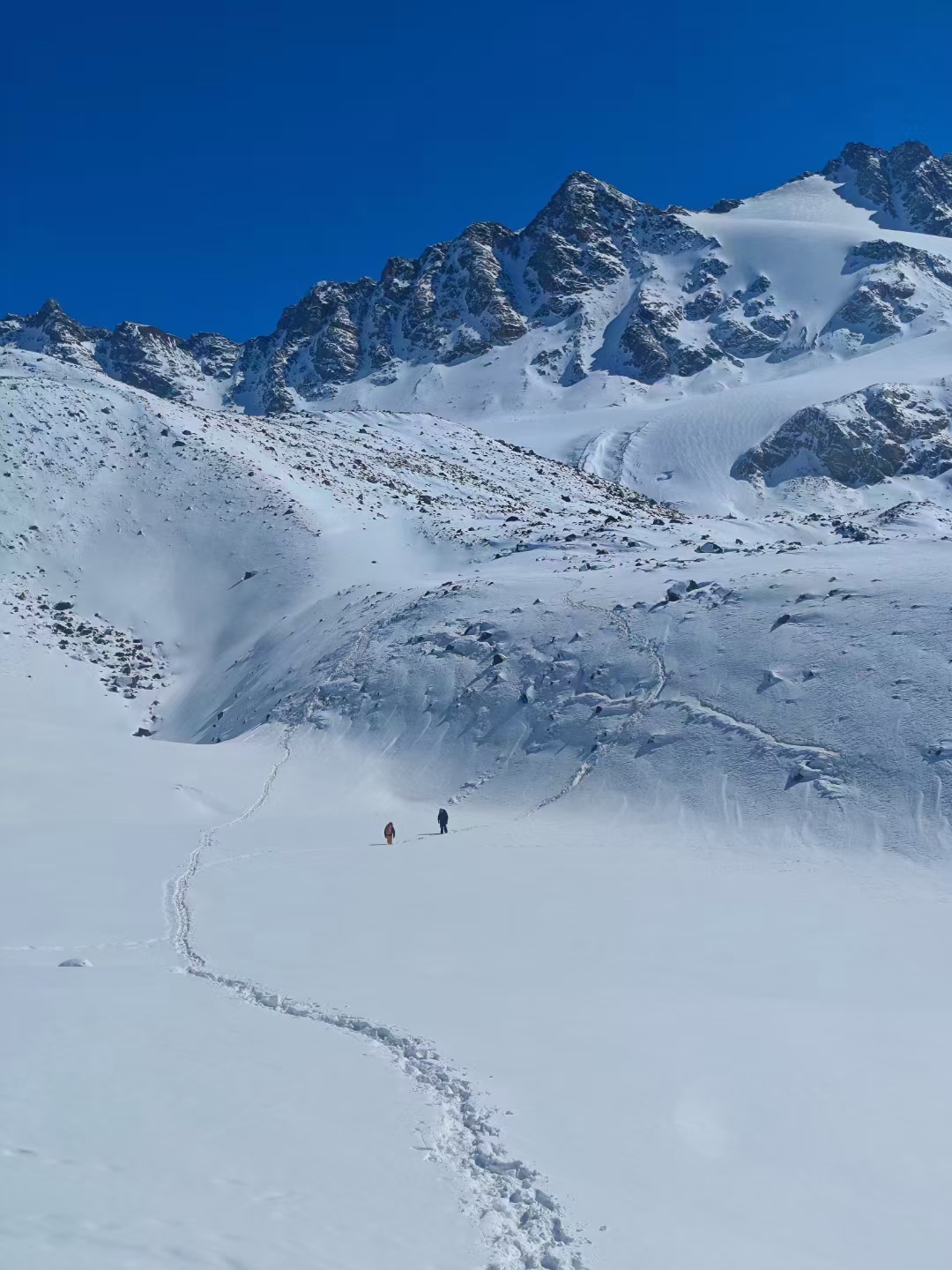 前进路线的坡度较陡,途中会有冰坡出现,需要结组攀登做好保护,不宜单行。在途中应控制好时间,最好在中午12点以前能登顶,因高原气候从中午以后天气都有较大的变化。