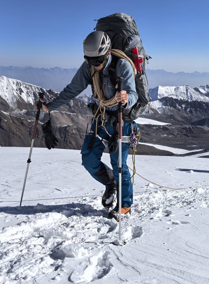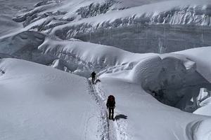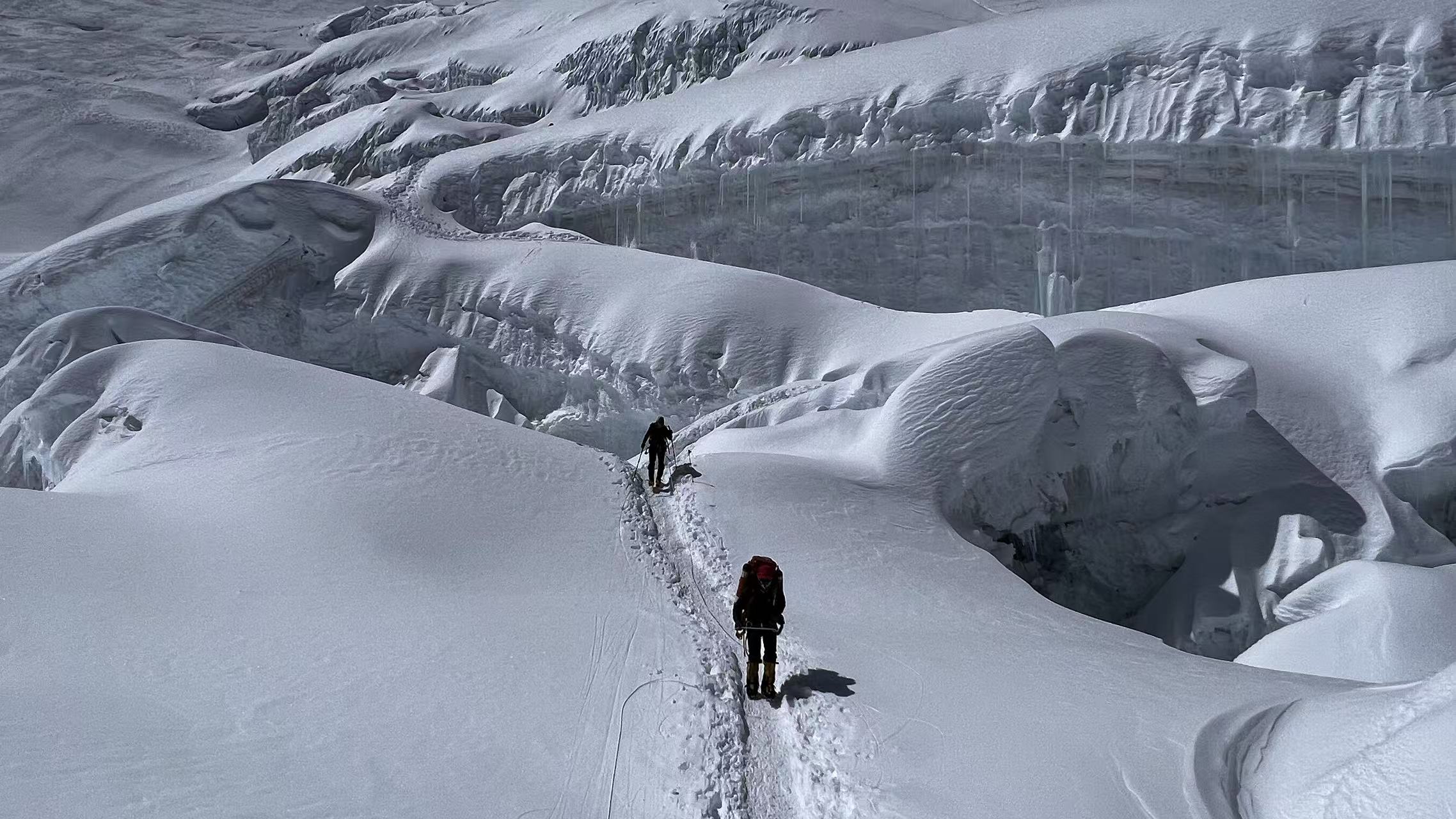 较长的35-40度的雪坡路段;C1-C2较多冰裂缝,结组和冰壁攀爬;攀登距离26公里、爬升3900米,攀登全程要完成5000-7000米3座山峰攀登
