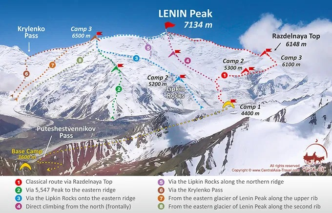 列宁峰距离吉尔吉斯斯坦第二大城市奥什(Osh)约200公里,中国新疆喀什仅380公里,从伊尔克什坦口岸出发130公里即可抵达大本营。攀登季节为每年7-8月。攀登1号路线最安全,山峰距离新疆喀什约550公里,大本营通车。