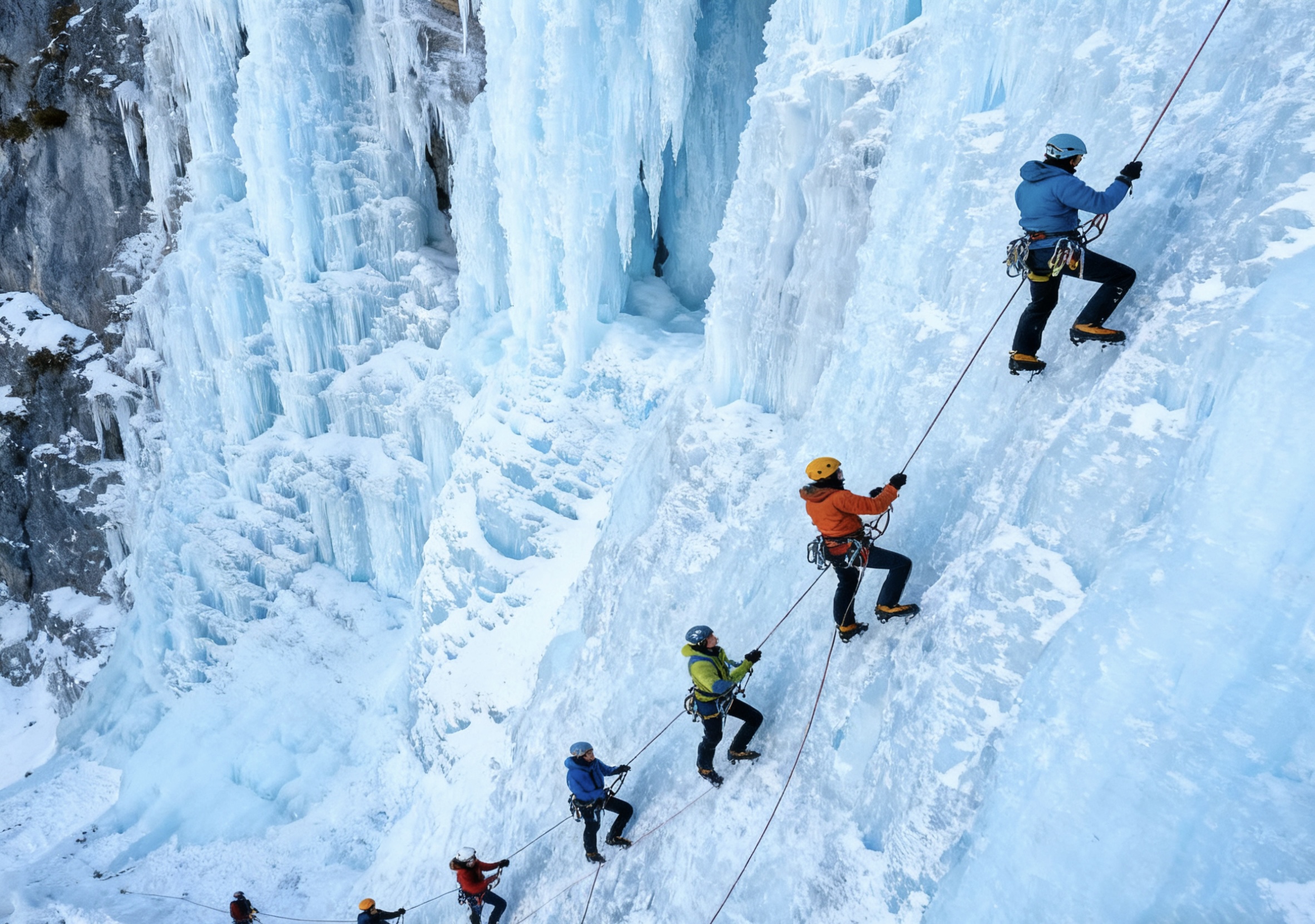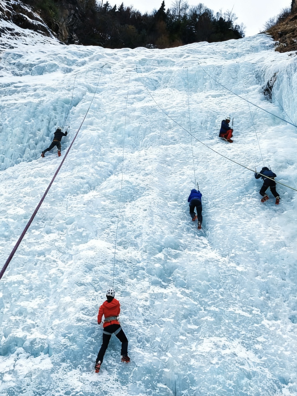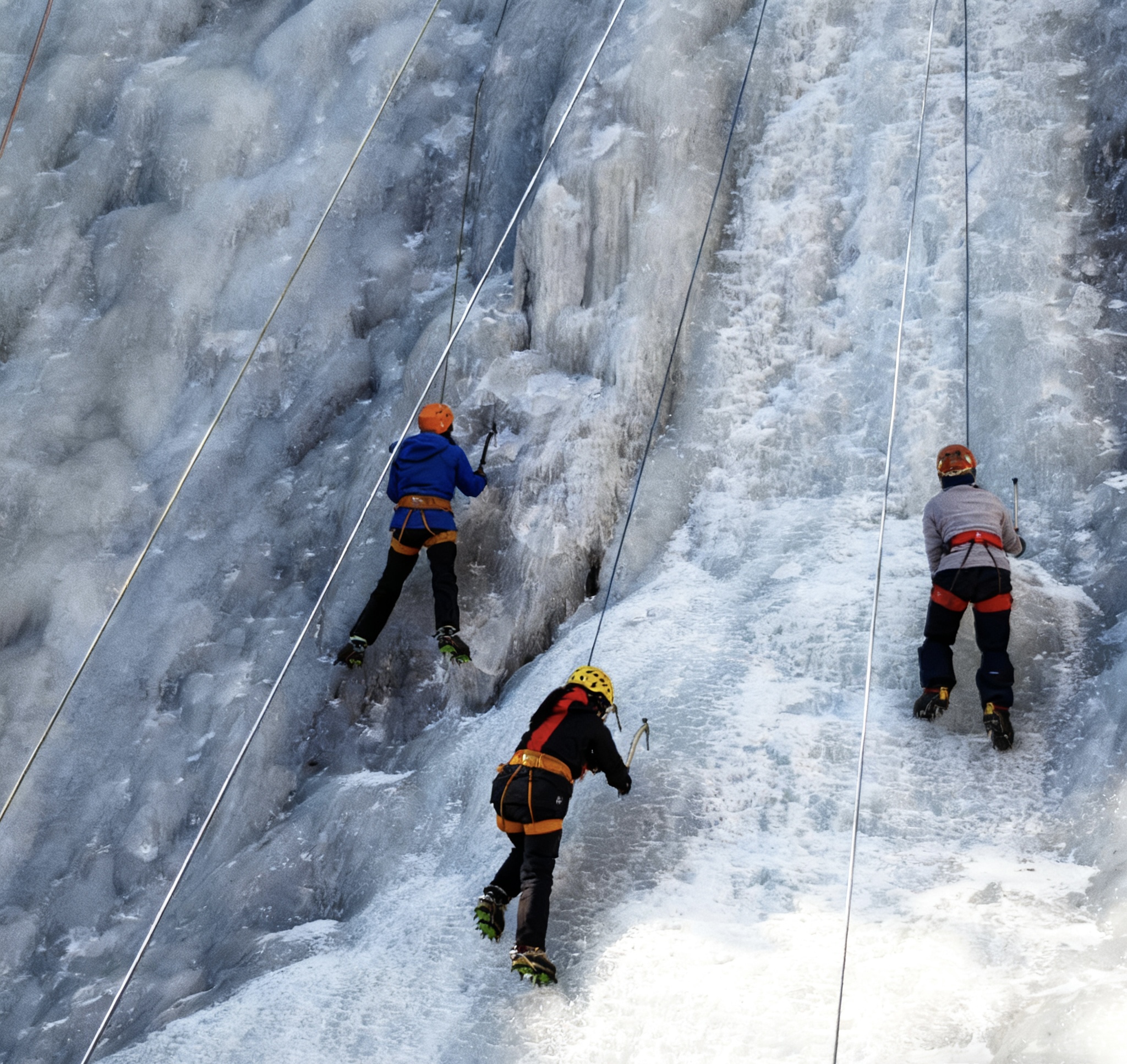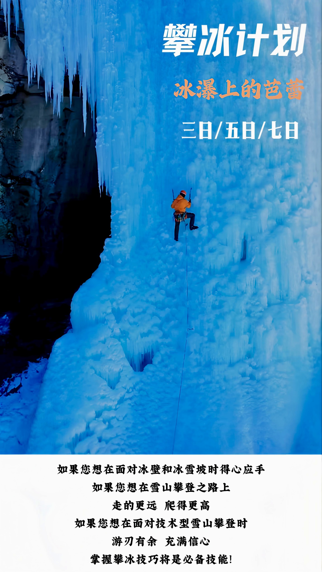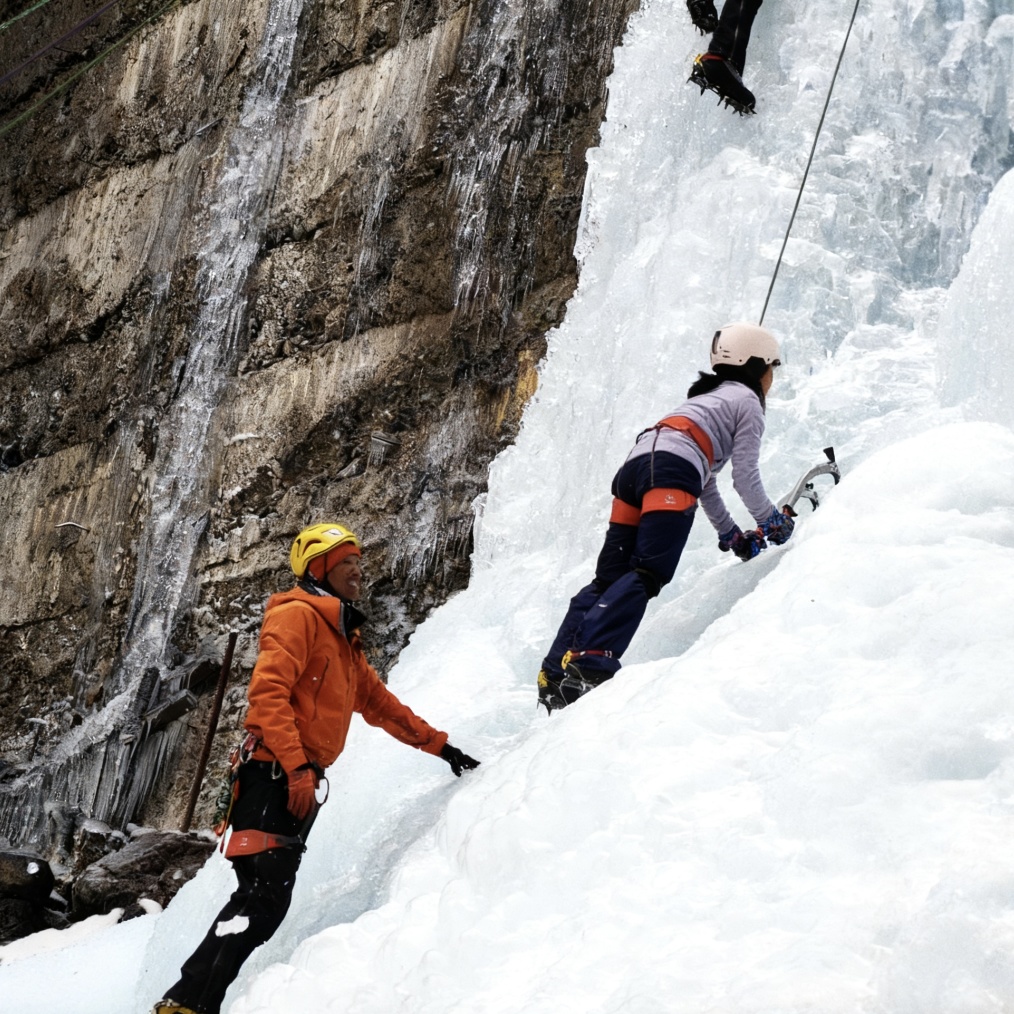 培训目标:具备自主攀登能力,熟练掌握攀冰器械;熟练掌握攀冰的系列技术操作,能攀登中级难度的冰壁。
