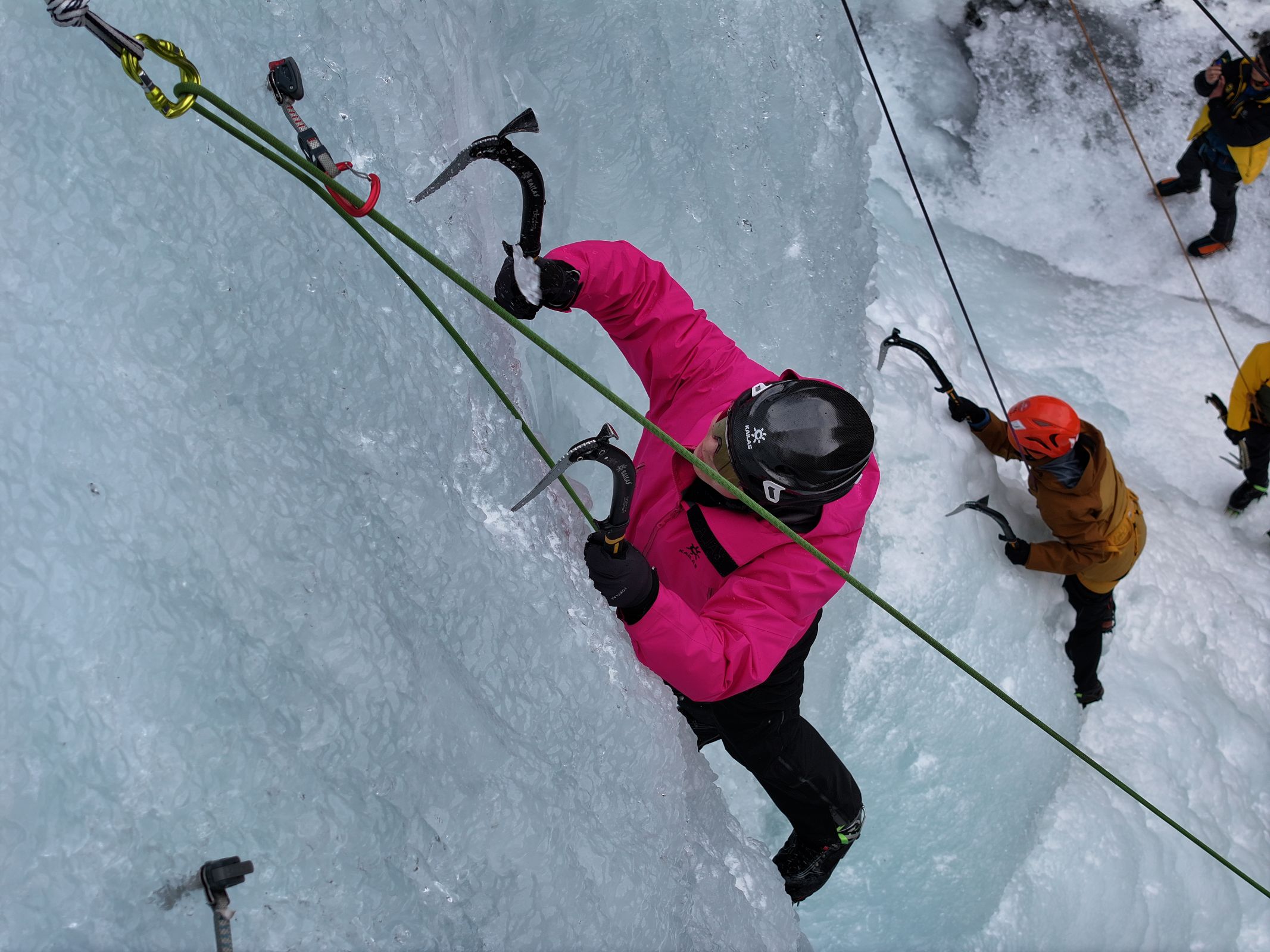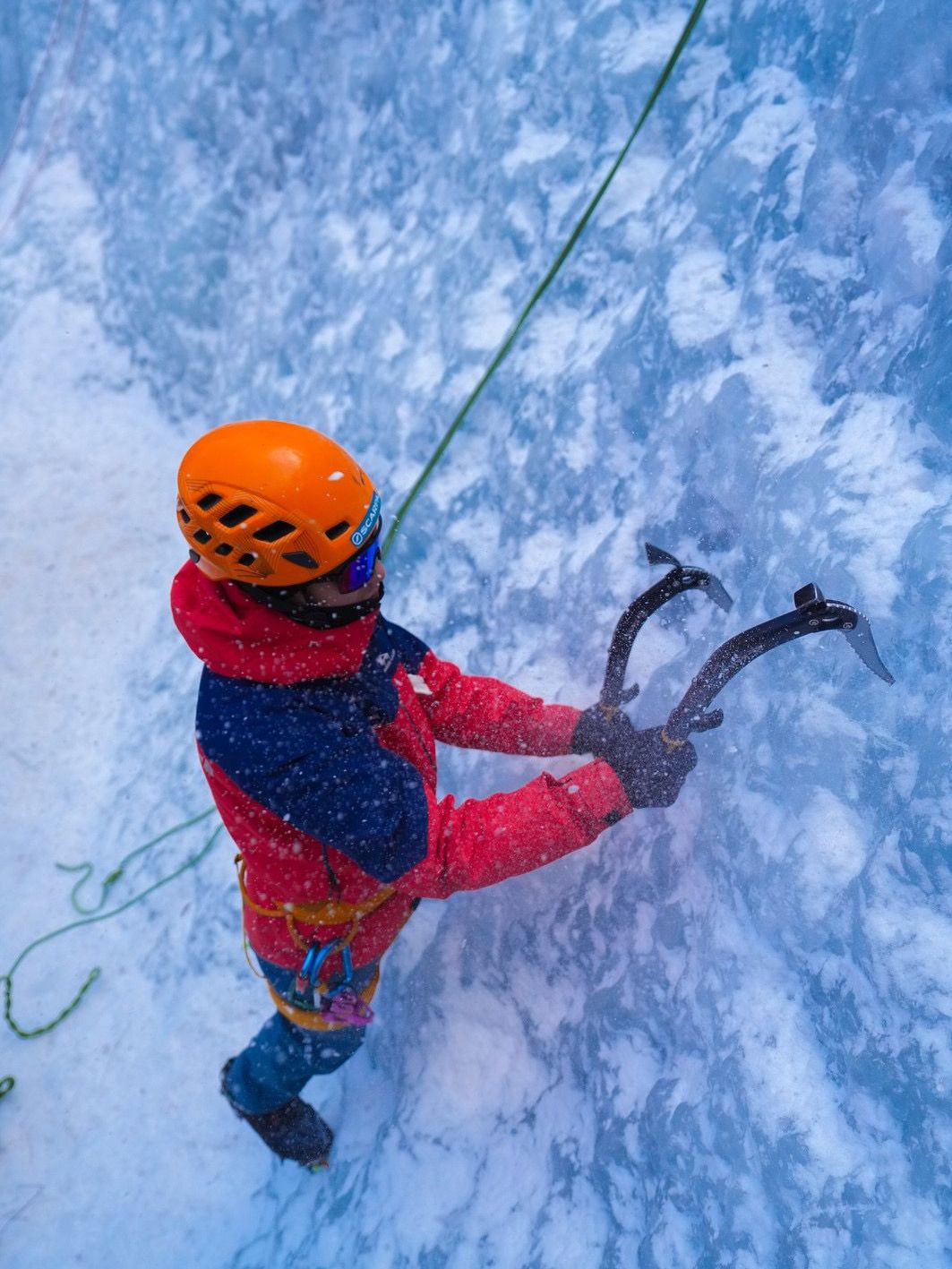 上午课程:复习攀冰课程,练习攀冰,强化挥镐、踢冰的动作标准性,对学员攀冰姿势检查及纠正。