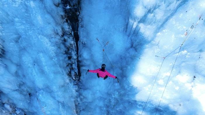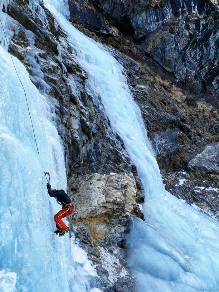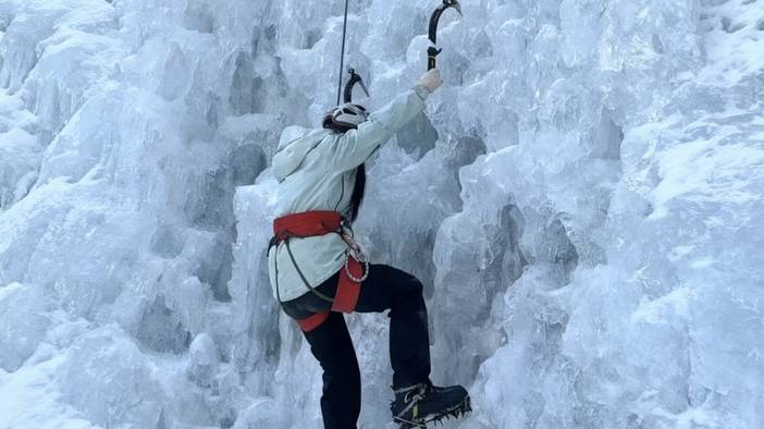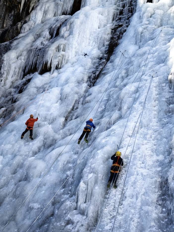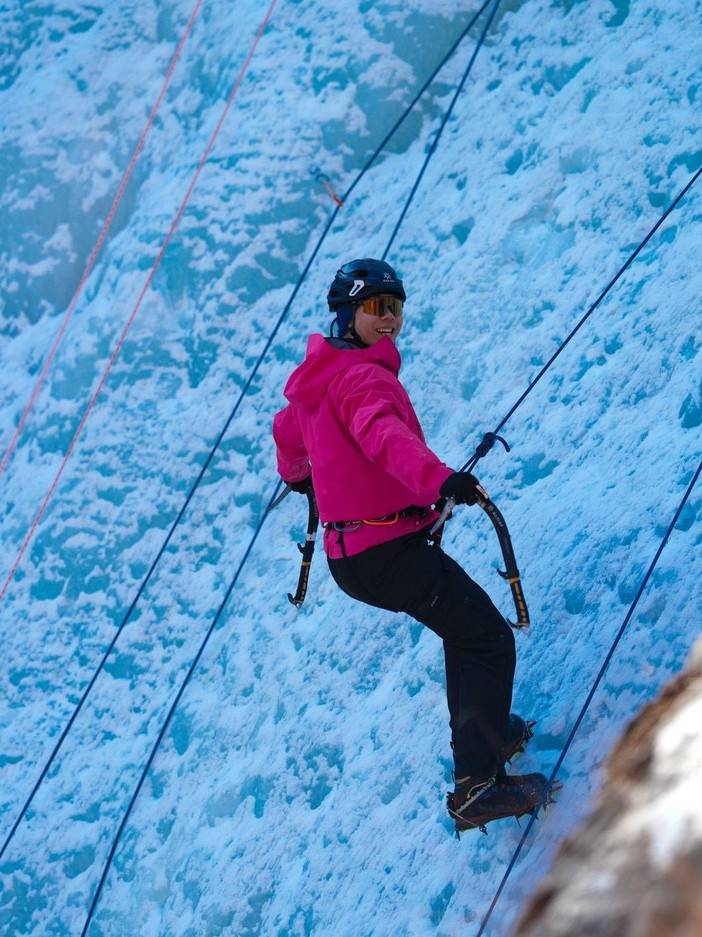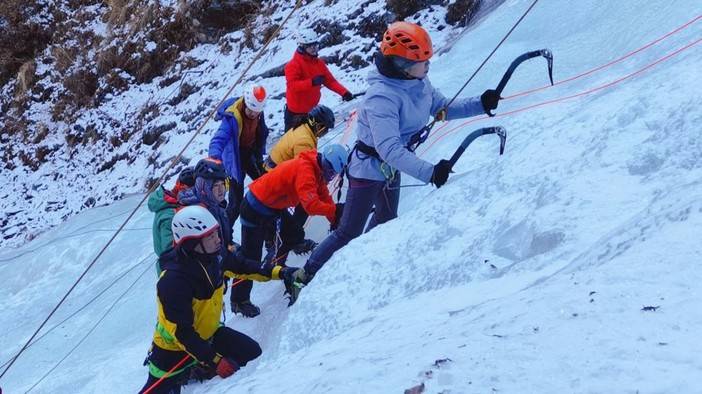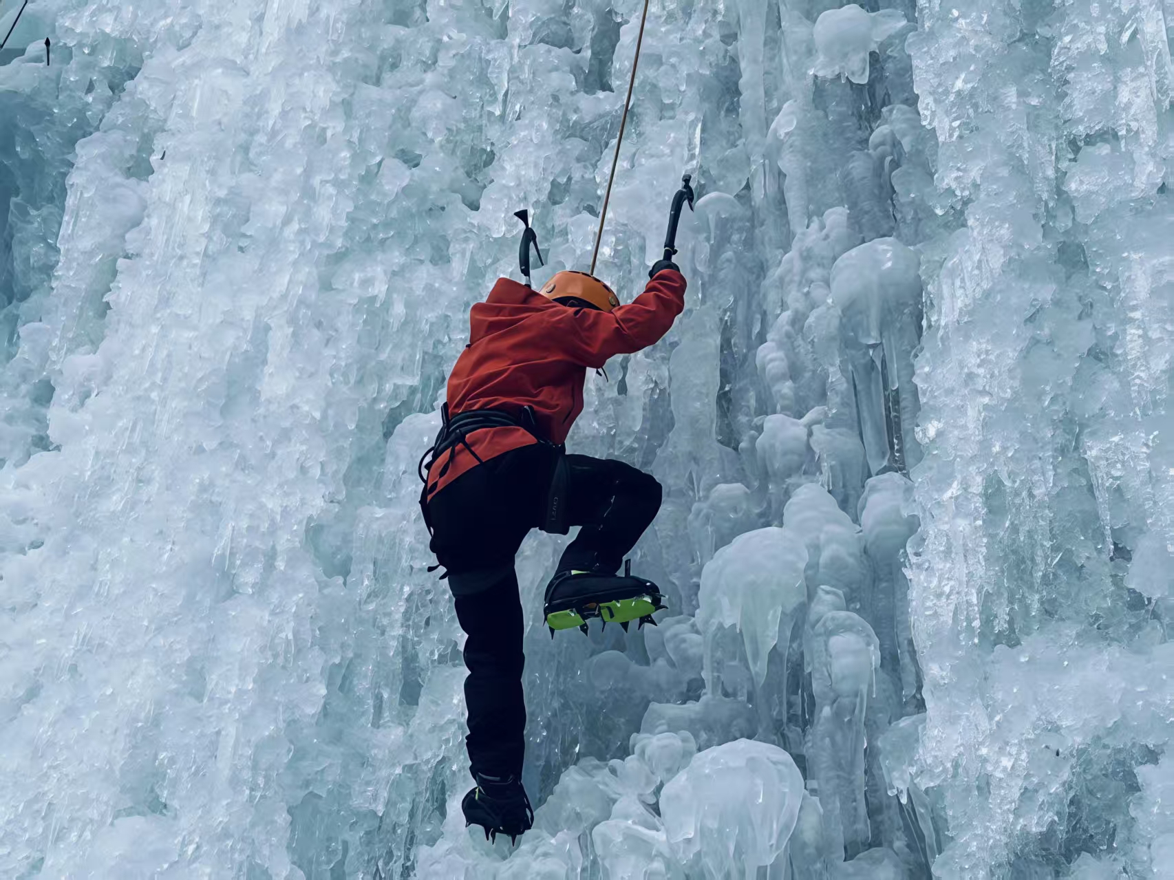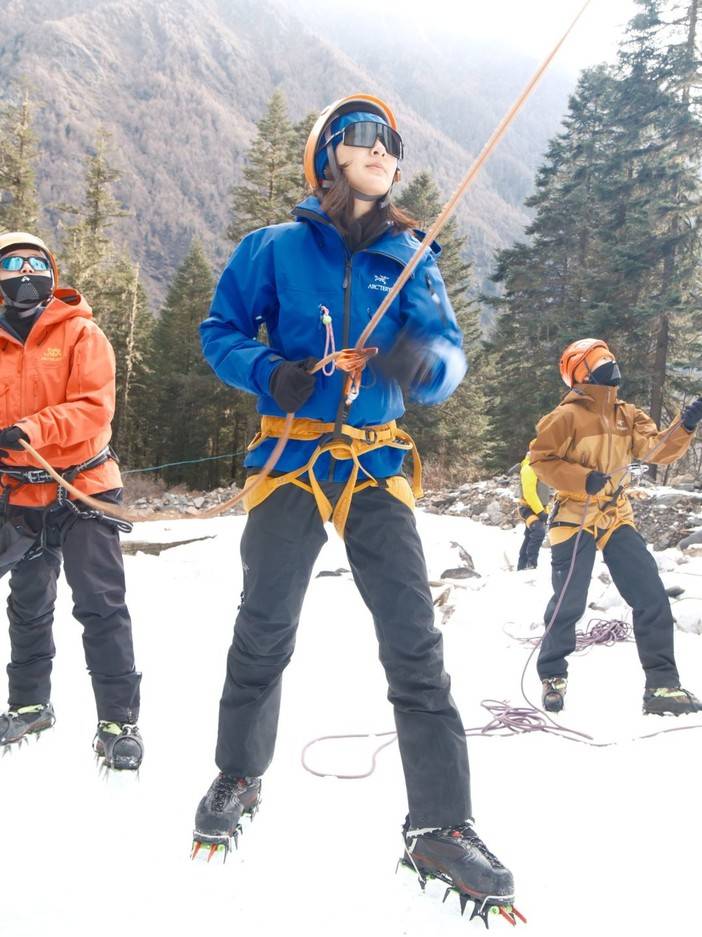 上午课程:复习攀冰课程,练习攀冰,强化挥镐、踢冰的动作标准性,对学员攀冰姿势检查及纠正。