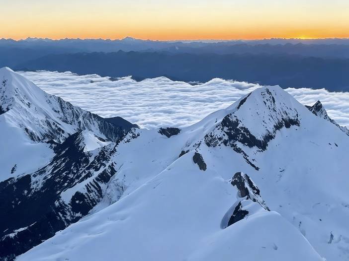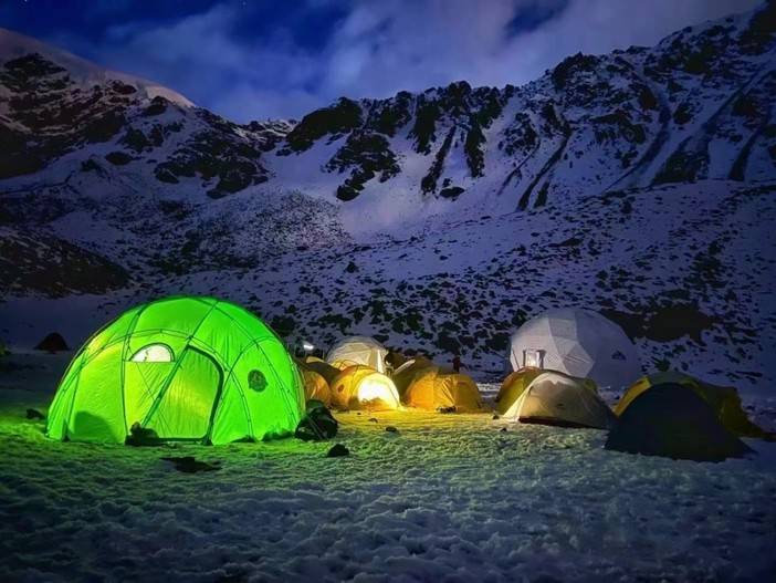 起床吃完早餐后,大约在凌晨3点出发冲顶,山体由碎石坡、冰雪坡、冰岩混合段、刃脊构成。有600–700米陡峭雪坡,冰裂缝密集,顶峰刃脊暴露感极强。