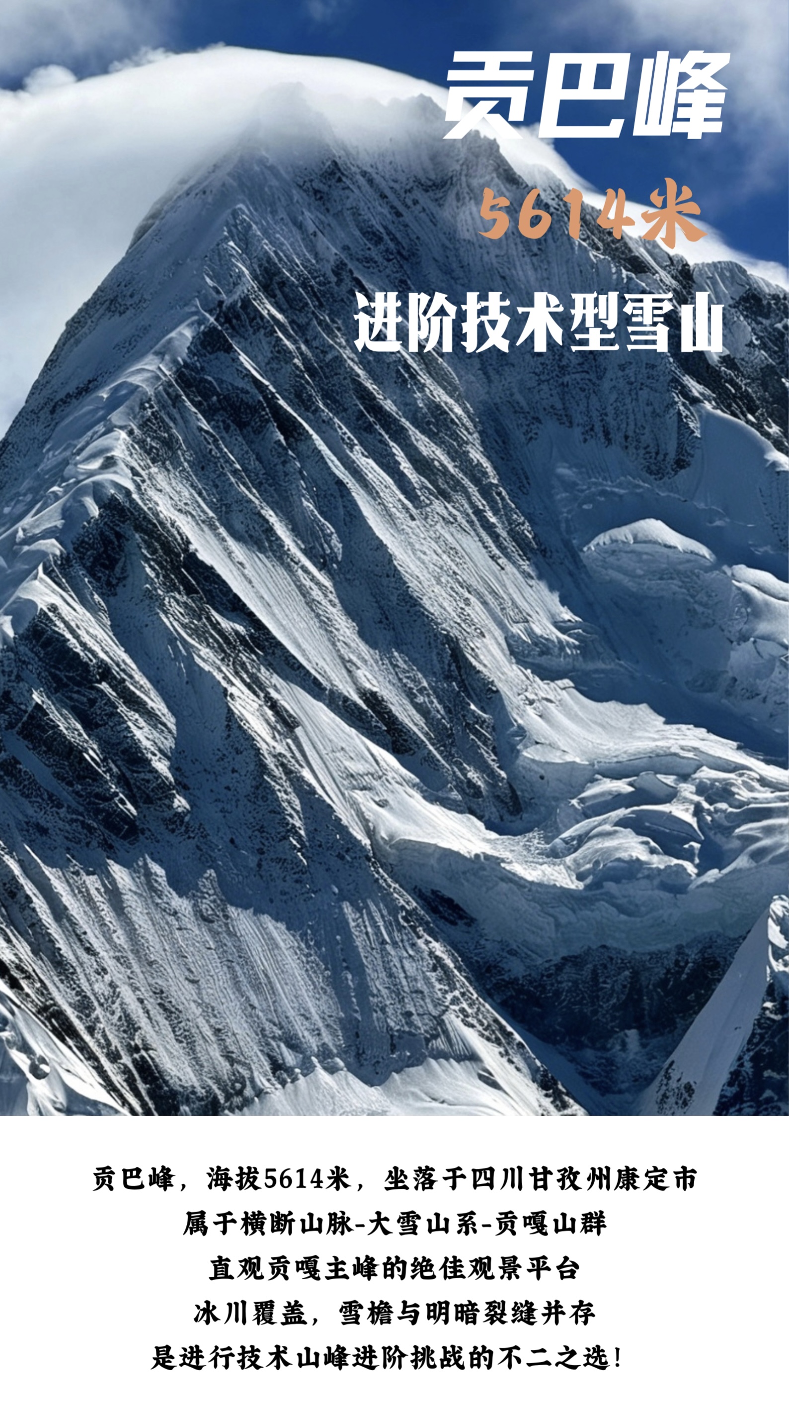 贡巴峰,一座海拔5614米的技术型山峰,位于四川省甘孜藏族自治州,属于横断山脉-大雪山-贡嘎山系,毗邻贡嘎主峰。攀登路线从高山草甸、湖泊,到大雪坡、大冰壁、岩石路段,再到冰川裂缝和暴露感极强的山脊线路,地形极为丰富。特别是穿越贡巴冰川时,密集的冰裂缝区宛如水晶迷宫,景象极为壮观,为攀登者带来沉浸式的进阶体验!