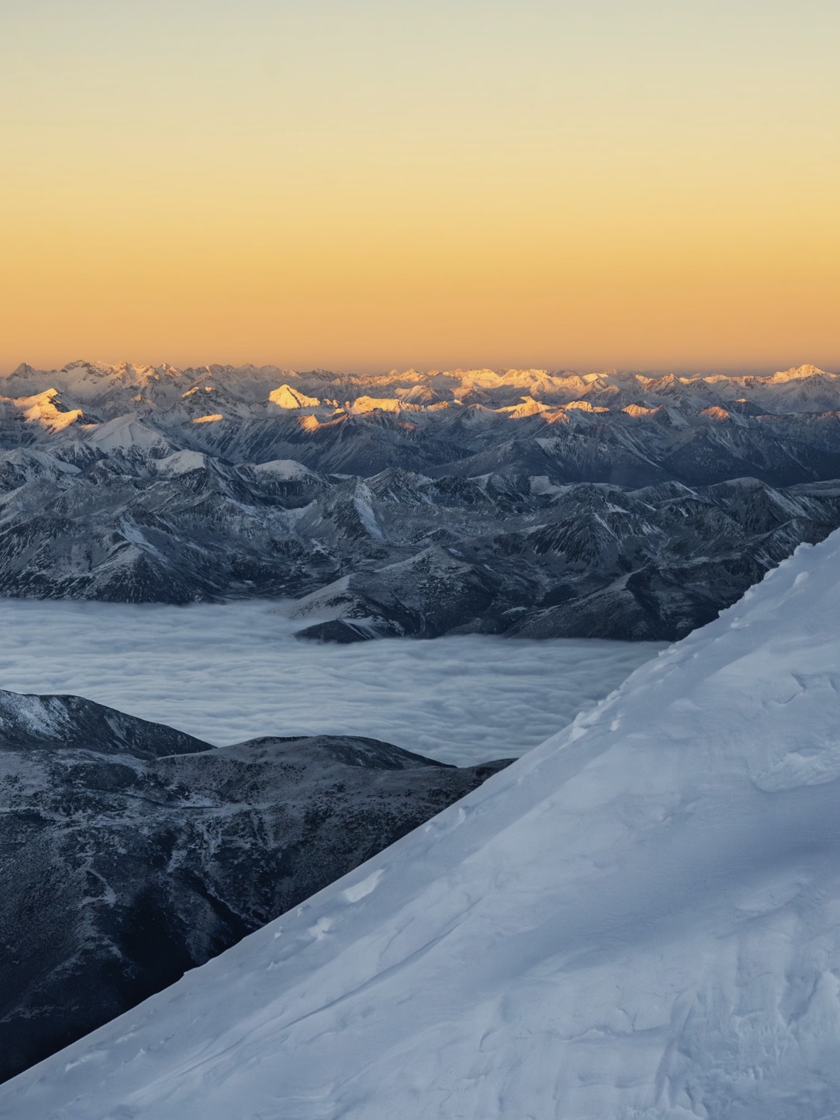 贡巴峰作为那玛峰的姊妹峰,在风景体验上更胜一筹。攀登途中不仅可以近距离观赏贡嘎雪山、朗格曼因、达多曼因、勒多曼因等多座雪山,还能饱览日出与日落金山的壮丽景象。