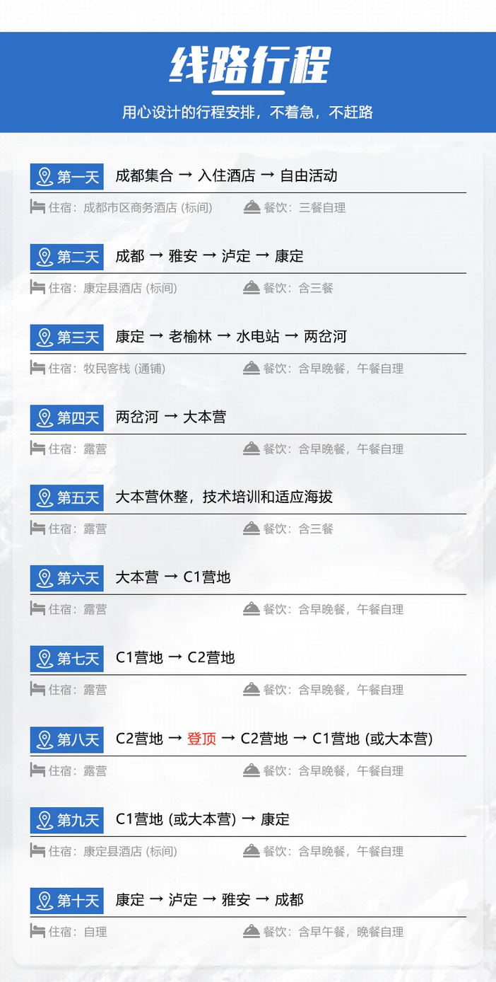 ▪️成都酒店住宿1晚,康定酒店住宿2晚,两岔河通铺住宿1晚,大本营住宿2晚,C1营地住宿1-2晚,C2营地住宿1晚