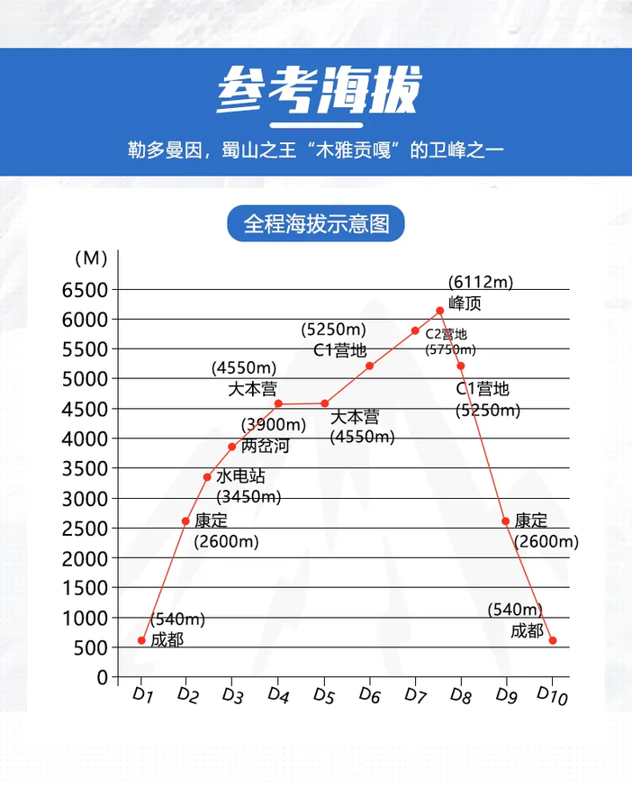 海拔:C1营地5250米,大本营4550米,康定2600米