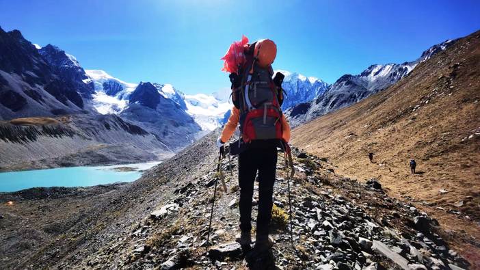 今日由大本营徒步前往C1营地。队员需背负保暖衣物、饮用水以及一份路餐,其他装备由协作背负,全程4km,海拔上升700米。