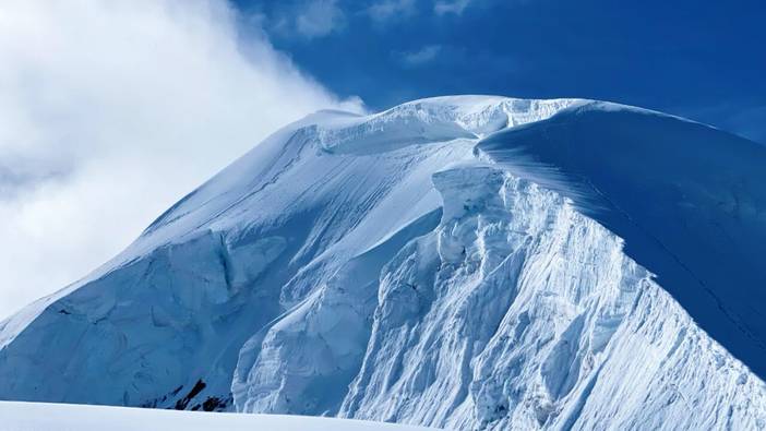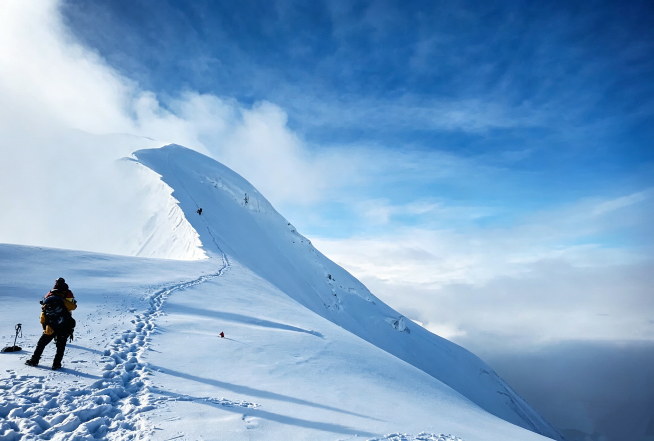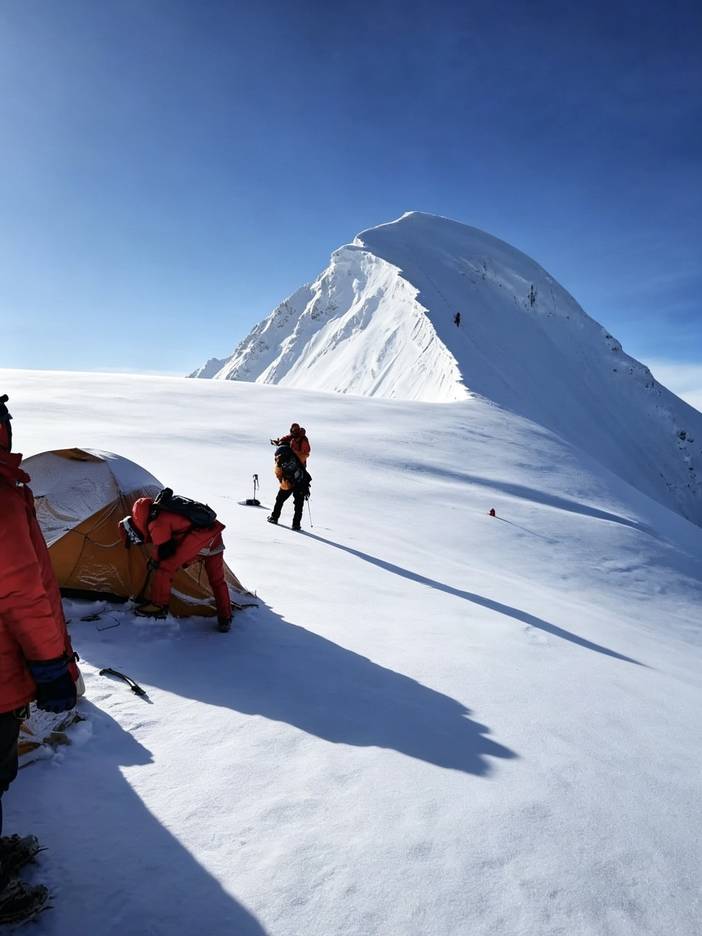 凌晨起床吃完早餐后出发冲顶,全程大概在1km左右,海拔上升400米,有较长的冰雪坡路段,部分路段较为陡峭,铺设路绳进行攀登,横切冰雪坡到顶峰后下撤回到C1(或大本营)。