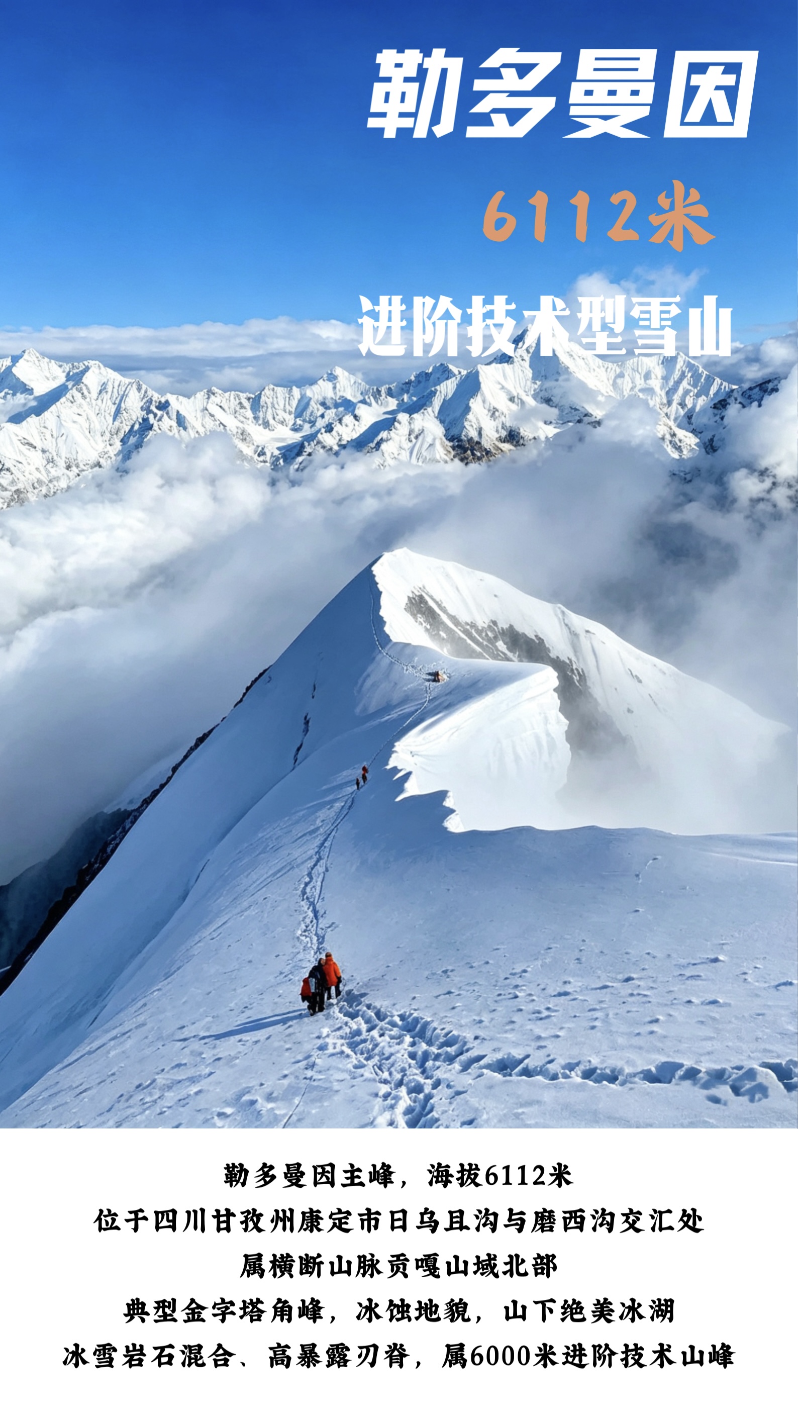 勒多曼因,主峰海拔6112米,位于四川省甘孜州康定县日乌且沟与磨西沟交汇处,属横断山脉贡嘎山域北部,是四川贡嘎山区一座极具代表性的6000米级技术型雪山。其山体为典型的金字塔形角峰,由冰川侵蚀而成,拥有壮观的大型海洋性冰川——勒多曼因冰川,北壁如银色瀑布倾泻而下,同时还孕育了海拔4600米的勒多曼因海子,景观绝美。